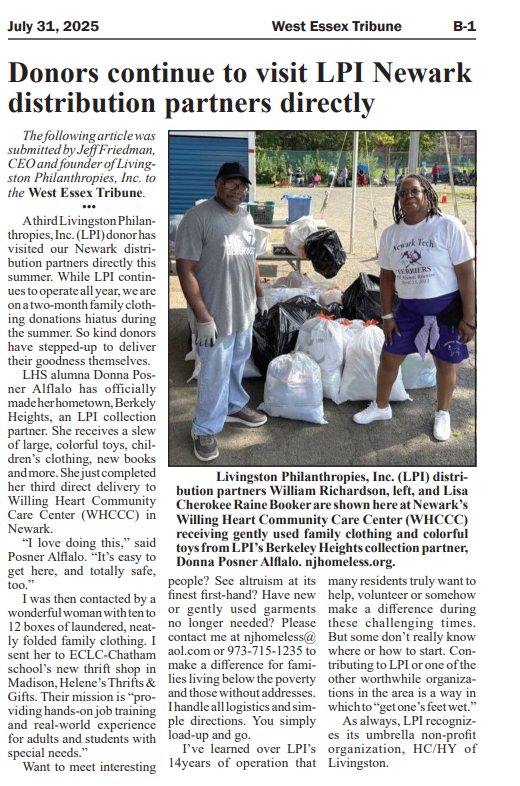 Livingston Philanthropies, Inc. (LPI) Now generous donors are invited to experience LPI's distribution partners directly while meeting truly nice and interesting people. Today's West Essex Tribune... (fb)
