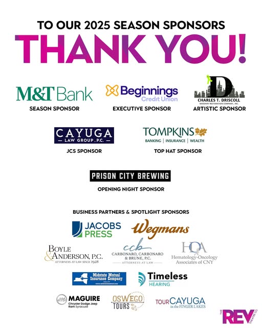 ✨✨GRATITUDE POST✨✨ We would like to say a big THANK YOU to our 2025 Season Sponsors, M&T Bank, Beginnings Credit Union, and Charles T. Driscoll Masonry Restoration Co., Inc.! We also want to thank our JESUS CHRIST SUPERSTAR Show Sponsor Cayuga Law Group (formerly WHMB, P.C.) and our TOP HAT Show Sponsor Tompkins Community Bank! Additionally, we want to thank our 2025 Business Partners and Spotlight Sponsors: Jacobs Press, Wegmans, Boyle & Anderson, P.C., Carbonaro, Carbonaro & Brune, P.C., Hematology/Oncology Associates of Central New York, Midstate Mutual Insurance Company, Timeless Hearing, Maguire Chrysler Dodge Jeep Ram of Syracuse, Oswego Tours, and Cayuga Tourism, NY! We'd be remiss if we didn't also shoutout our incredible Opening Night Sponsor Prison City Pub & Brewery! Finally, to all of our playbill advertisers, individual donors, and patrons...THANK YOU! We can truly say that we wouldn't be able to do what we do without you. Thanks for making our 2025 season so special! (fb)