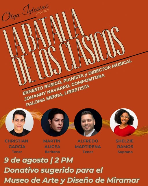 🇵🇷 Nuestra herencia musical vive y respira el 9 de agosto. En el corazón de Miramar, cuatro voces extraordinarias dan vida a los gigantes de la música clásica puertorriqueña del siglo 19 en el @madmiorg. Esta no es solo una presentación; es una celebración de quiénes somos y de dónde venimos. Y marca un momento histórico, el debut del Maestro Ernesto Busigó como nuestro Director Musical oficial, tras casi cuatro años y más de 70 presentaciones juntos. Acompáñanos el sábado, 9 de agosto, 2:00 PM Museo de Arte y Diseño de Miramar Donativo sugerido $8 estudiantes, $10 adultos, incluye acceso a las galerías de exhibición del MADMi. Te esperamos para hacer historia juntos 🎶 @chopiola - pianista y Director Musical @johannyivelisse - compositora @pasierra - libretista @tenorboricua - tenor @martirena_alfredo - tenor @shelziesoprano - soprano 🇵🇷 Our musical heritage lives and breathes on August 9th. In the heart of Miramar in San Juan, PR, four extraordinary voices bring to life the giants of Puerto Rican classical music of the 19th century at the @madmiorg. This isn’t just a performance, it’s a celebration of who we are and where we come from. And it marks a historic moment: the debut of Maestro Ernesto Busigó as our official Musical Director, after nearly four years and more than 70 performances together. Suggested donation of $8 students, $10 adults, includes access of the MADMi. Join us Saturday, August 9th, 2:00 PM Museum of Art & Design of Miramar We’re waiting for you to make history together 🎶 #elMADMi #recital #nonprofit #olgaiglesiasproject #puertorico #puertoricanculture #puertoricanmusic #culturapuertorriqueña #opera #johannynavarro #palomasierra #opera #operasingers (fb)