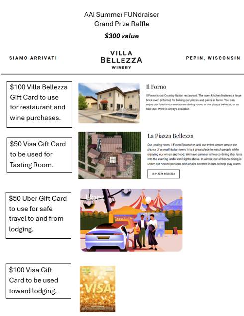 Can't attend the Annual Summer FUNdraiser? You don't need to be present to win in the Grand Prize Raffle! If you purchase your tickets through the registration page by 4:00 today, we will enter you into the drawing. Tickets $5. GRAND PRIZE is $300 Villa Billezza Winery and Vineyard package: $100 to its restaurant and wine store, $50 to use for the Wine Tasting Room, $100 gift card to use toward lodging, and a $50 Uber gift card to ensure safe travels to and from If you have never been to this winery, you must try it out. A hidden gem in Lake Pepin area... Other two prizes include: Chanhassen Dinner Theater - Two tickets for show and dinner, valued at over $200 Woodhouse Day Spa - $200 Gift Card Good luck! www.2025summerFUNdraiser.givesmart.com (fb)