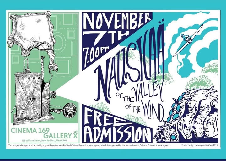 Friday, November 7 at 7pm… Cinema 169 presents a free screening of NAUSICAÄ OF THE VALLEY OF THE WIND, the 1984 animated fantasy film by Hayao Miyazaki. This screening is free and open to the public, refreshments will be available to purchase inside Gallery X. Doors at 6:30, the screening will begin at 7:00. Cinema 169 is supported in part by a grant from the @nbculturalcouncil a local agency which is supported by the @masscultural a state agency. (fb)