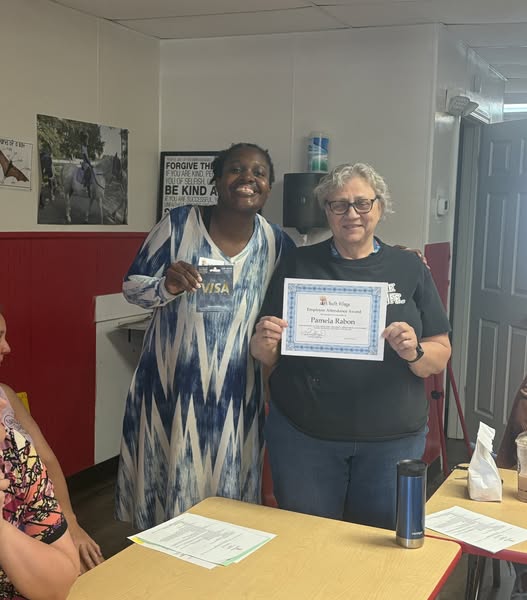 Ms. Pamela Rabon, Youth Village’s Administration Assistant, has been presented with the Inaugural Employee Attendance Award in recognition of her dedication, reliability, dependability and the love and care she shows for the children and staff members of our program. Miss Pamela has been employed at Youth Village for 457 days…and counting. She has only been absent for a total of 8 days during this time and out of those 8 days she has only been sick 1 day! In addition, Miss Pamela has only been tardy for 3 days and that was only because of the heavy, notorious traffic on Highway 98! On top of that she works Monday-Friday from 7:00am-6:00pm… longer hours than ANYONE else at Youth Village! We are ALL so grateful to have such a wonderful, dedicated and reliable employee. Miss Pamela was presented with the special certificate and a VISA gift card by Youth Village Director Miss Valerie Bogar. Thank you so much Miss Pamela…you are greatly appreciated! Standing next to Miss Pamela is Valerie Bogar. (fb)