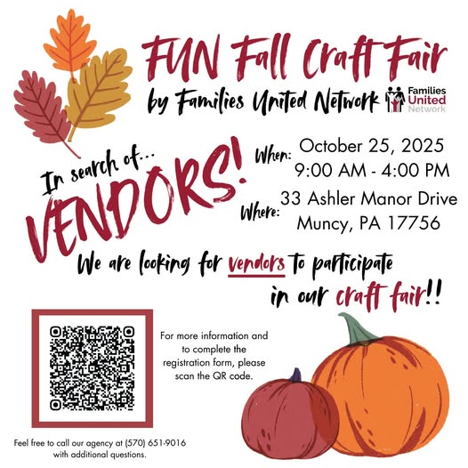 🌟 Calling All Vendors! 🌟 Families United Network is hosting a Fall Craft Fair on Saturday, October 25th in Muncy, and we're searching for vendors to join us! Don't miss this opportunity to share your passion and grow your reach! Interested or would like more information? Click on the link or scan the QR code. ▶️ https://bit.ly/3IyGsBD 📅 Spaces are limited, so act fast! #FUNFallCraftFair #SupportLocalCrafters #FamiliesUnitedNetwork (fb)