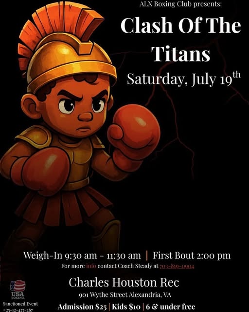 🥊 @alxboxingclub is hosting its annual tournament: Clash of the Titans this Saturday, July 19th at the @charleshoustonrec Get ready for an action-packed @usaboxing sanctioned tournament featuring fierce matchups and rising talent. 💥 First Bout is at 2:00 pm 📍 Alexandria Boxing Club, at the Charles Houston Recreation Center 🎟️ All proceeds go directly to support our gym and young fighters chasing their dreams. Don’t miss it. Be there. #ClashOfTheTitans #AlexandriaBoxingClub #USABoxing #SupportLocalGyms #BoxingCommunity #FightNight (fb)