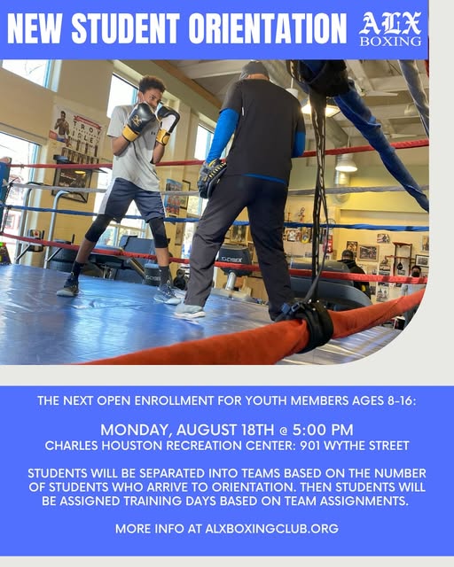 🥊 Next Youth Enrollment – Alexandria Boxing Club 🥊 Open to ages 8–16 📅 Monday, August 18th @ 5:00 PM 📍 Charles Houston Rec Center – 901 Wythe St. New students will be placed into teams at orientation. Training days will be assigned based on team groupings. 💻 More info: alxboxingclub.org (fb)