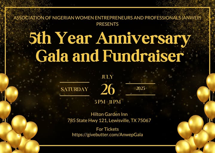 🎉 Join Us for ANWEP’s 5th Year Anniversary & Fundraising Gala! 🎉 We’re excited to celebrate 5 years of impact at our upcoming anniversary gala with the theme “A Legacy of Empowerment: Celebrating 5 Years of Impact!” 📅 Date: Saturday, July 26, 2025 📍 Venue: Hilton Garden Inn, Lewisville, TX ⏰ Time: 5 PM – 11 PM 🎩 Dress Code: Evening/Formal, Colors: Black with a touch of Gold This special evening will be filled with inspiration, celebration, and recognition as we honor incredible leaders who are elevating the voices of women in our community. 🌟 ✨ Secure Your Tickets Today: https://givebutter.com/AnwepGala Let’s make it a night to remember and continue the legacy of empowering women in our communities! #ANWEPGala #5YearsOfImpact #EmpoweredWomen (fb)