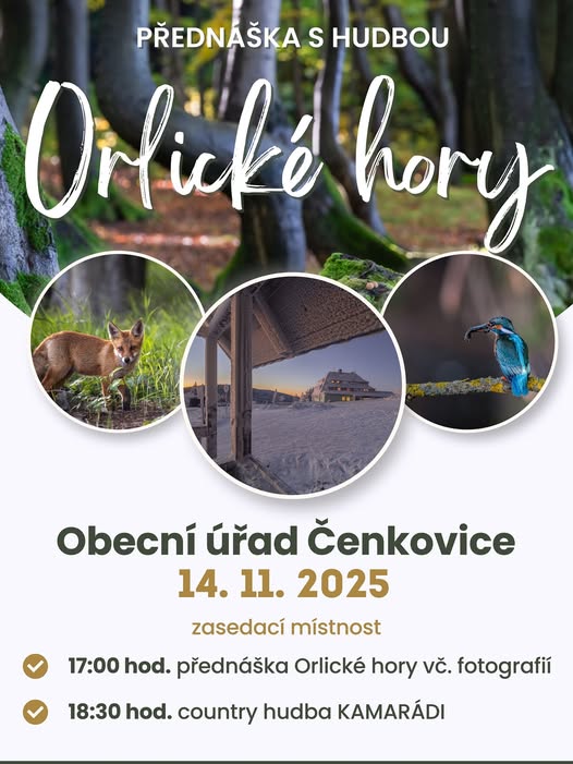 Obec Čenkovice vás zve v pátek 14.11.2025 na přednášku Orlické hory s fotografem Rostislavem Bartoněm a jeho nádhernými fotografiemi. Přednáška proběhne v zasedací místnosti obecního úřadu v Čenkovicicích od 17:00. Rostislav Bartoň / Fotografie Poté bude od 18:30 večer pokračovat vystoupením country kapely Kamarádi. K občerstvení bude točená Plzeň, víno a limonády, k zakousnutí pak pečená žebra nebo obložené talíře. #cenkovice #prednaska #orlickehory #fotografie #landscapes #country #kamaradi (fb)