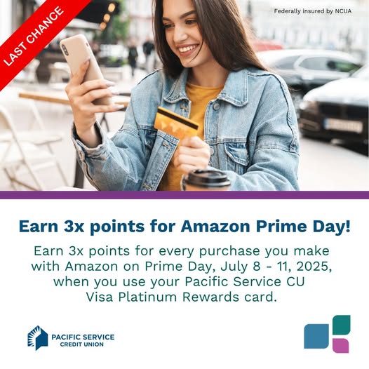 Don't miss out! Today is the final day of Amazon Prime Day 🛍️ Earn 3x points on every Amazon purchase when you use your Pacific Service CU Visa Platinum Rewards card. Treat yourself while earning reward points that can be redeemed for travel, brand-name merchandise, gift cards and more. Shop now and make every purchase even more rewarding. https://nuvi.me/859i8e (fb)