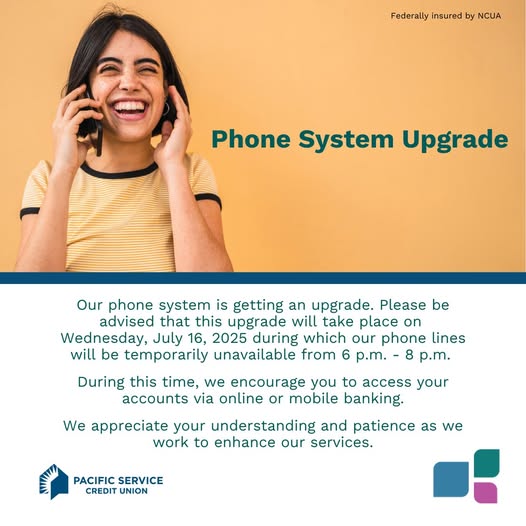 Our phone system is getting an upgrade. Please be advised that this upgrade will take place on Wednesday, July 16, 2025 during which our phone lines will be temporarily unavailable from 6 p.m. - 8 p.m. During this time, we encourage you to access your accounts via online or mobile banking. We appreciate your understanding and patience as we work to enhance our services. If you have any questions or need additional information before the scheduled upgrade, please contact a member service representative at (888) 858-6878. (fb)