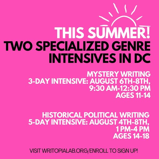 We’re running some exciting specialized programs this summer at our Washington DC lab! In Mystery Writing, young writers will craft their own suspense stories and explore craft topics like mystery terminology, creating suspense, building impactful settings, and understanding the impact of mystery stories. In Historical Political Writing, writers will craft an original piece of historical fiction that takes place against a larger political backdrop. They’ll discuss best practices for research, translating research into fictional story, understanding the difference between journalism and historical fiction, and help writers find meaning from stories about their own lives and the people around them. . . . Visit the link in our bio or visit writopialab.org/enroll to find out more and sign up! #historicalfiction #books #stories #novels #author #youngwriters #amwriting #mystery #fiction #creativewriting #education #summercamp #nonprofit (fb)