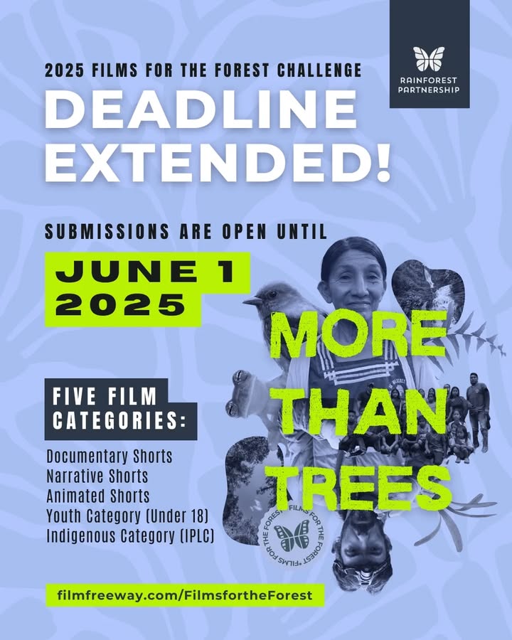 "🎉 Exciting news! 🎉 We’ve officially extended the submission deadline for Films for the Forest 2025 until June 1! 🌳✨ This is your chance to share a powerful short film that inspires action for our world’s forests. Whether you're a first-time filmmaker or an experienced storyteller, we want to see your vision! 🎬 Five categories 🌍 Global submissions encouraged 🗓️ New deadline: June 1, 2025 Submit your film today ➡️https://filmfreeway.com/FilmsfortheForest #FilmsForTheForest #ForestFilms #FilmmakerOpportunity #EnvironmentalStorytelling #ShortFilmChallenge #CallForEntries #FilmForChange" (fb)