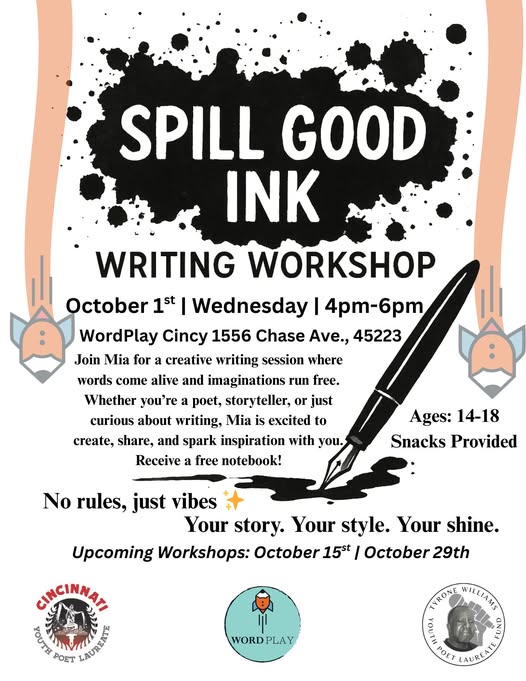 Next Week at WordPlay Cincy! Join the Cincinnati Youth Poet Laureate, Mia, for the Spill Good Ink Writing Workshop! When: Wednesday, October 1 Time: 4 pm - 6pm Where: WordPlay Cincy 1556 Chase Ave ---------------- The Youth Poet Laureate is a national program and the Cincinnati chapter is hosted through WordPlay Cincy. This program is powered by the Tyrone Williams Fund and made possible by the generous donations from YOU. Please consider making a donation here: https://lnkd.in/gSHTPbMh -------------- About Tyrone Williams: Tyrone Williams was a distinguished poet and educator who dedicated his life to teaching, mentoring, and supporting writers of all ages. His career at Xavier University and extensive community involvement left a profound impact on the City of Cincinnati. His influence on contemporary poetry, literary criticism, and African American literature is celebrated with the dedication of the Cincinnati Youth Poet Laureate program in his honor. Donate at: https://lnkd.in/gSHTPbMh (fb)
