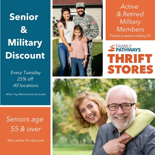 Every Tuesday, seniors and military members enjoy an extra 25% OFF their entire purchase at Family Pathways Thrift Stores! 🙌🛒 ✔️ Seniors 55 and over, just ask the cashier for your discount. ✔️ Military members (active and retired), simply show your ID to save! 🗓️ This offer is valid at all 10 of our locations! Shop today for extra savings! 🛍️ Thank you for supporting your local thrift store and community! 💙 *Note: Discount excludes white tag merchandise and cannot be combined with other promotions or coupons. #ThriftyTuesday #SeniorDiscount #MilitaryDiscount #ShopSmartDoGood #FamilyPathwaysThriftStores (fb)
