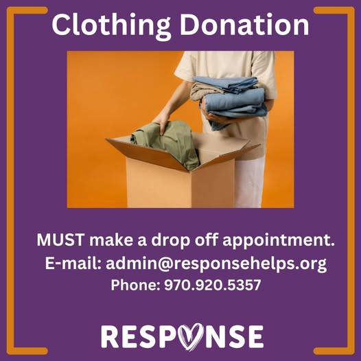 🧥👖 Clothing Donations Needed! 👗🧤 We’re currently accepting new, like-new, or gently used clothing to support survivors of domestic and sexual abuse and their children. All sizes and styles are welcome from kids to adults! Important: 📅 Drop-offs are by appointment only. Please call or message our office to schedule a time before bringing donations. E-mail: admin@responsehelps.org Phone: 970.920.5357 ✅ We accept: Clean, gently used, like-new, or new clothing Seasonal wear (jackets, sweaters, etc.) Shoes and accessories in good condition ❌ We cannot accept: Damaged, stained, or worn-out items Thank you for helping us make a difference! 💛 #ClothingDrive #DonateResponsibly #CommunitySupport #ClothingDonations (fb)