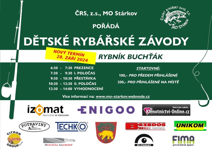 !!!DŮLEŽITÉ!!! Dobrý den, máme pro Vás důležité sdělení ohledně dětských rybářských závodů na rybníku Buchťák. Sobotní předpověď počasí není vůbec příznivá. S touto předpovědí hrozí naprosto nevhodný podmínky pro konání takové akce. Proto jsme rozhodli s ohledem na bezpečnost závody přeložit na 28. ZÁŘÍ. Vaše již přijaté přihlášky zůstávají v platnosti, pokud by se Vám nový termín závodů nehodil, dejte nám prosím vědět, abychom Vás ze seznamu přihlášených vyškrtli. Děkujeme za pochopení a věříme, že si to společně užijeme v novém termínu! Ing. Karel Andres vedoucí mládeže ČRS, z.s., MO Stárkov (fb)