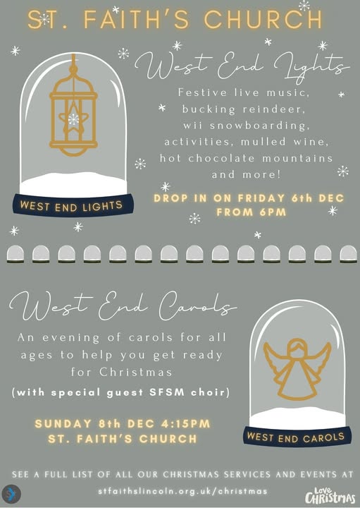 This is one of our favourite weekends in the West End and you would be so welcome to be a part of it. We will be open from 6pm-9pm as part of the West End Lights event. Free Hot chocolate, popcorn and hotdogs. Or why not enjoy some mulled wine (small charge). Activites, crafts, live music, wii snowboarding and even a bucking reindeer! Then on Sunday be a part of the countdown to Christmas at our 4:15 west end carols featuring the West Ends very own SFSM choir. (There is no 10:15 morning service this Sunday but you are very welcome to join us as we head to the 10:15 joint service at St. Swithin's in the Salthouse (Free School Lane). There will also be a more contemplative Holy Communion at 6:15pm at St. Faith's this Sunday) We hope you can join us over the coming weekend - It won't be the same without you! (fb)