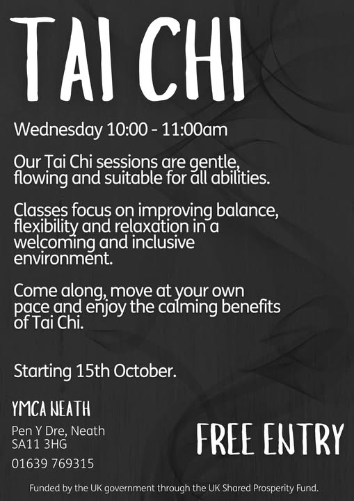 Coming soon- Tai Chi at YMCA Neath ✨ Starting Wednesday 15th October. FREE ENTRY - no booking required. All levels welcome! Funded by the UK Government through the UK Shared Prosperity Fund. (fb)