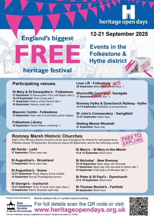 Heritage Open Days - England's festival of FREE ENTRY heritage venues and events - takes place from 12-21 September this year. In the Folkestone & Hythe District, there are 20 events taking place. You can see an overview on the poster. Tour nine churches including access to some usually off-limits areas and a church fair; look round the Masonic Centre, a chapel or a windmill; see historic photo displays; attend talks and guided tours; and learn Where to Start Researching Your Family History! For full details, look at the printable list for the district: https://www.heritageopendays.org.uk/whats-on/printable-area-lists/folkestone-and-hythe.html Several events require booking, so don't delay! It's all free! (fb)