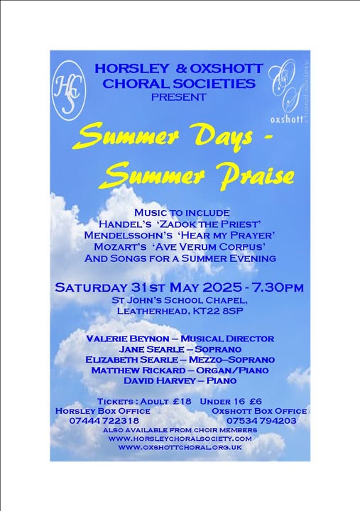 Feeling the post Bank Holiday blues? Here's something to cheer you up this weekend! Horsley Choral Society will be holding a joint summer concert with Oxshott Choral Society this coming Saturday 31st May at St John's School Chapel, Leatherhead. The concert entitled 'Summer Days - Summer Praise' will include music by #mozart, #handel and #Mendelssohn with songs for a Summer evening. The choirs will be joined by professional soloists, Jane Searle (soprano); Elizabeth Searle (mezzo-soprano); Matthew Rickard (organist, pianist) and David Harvey (pianist). It will be a particularly poignant concert for both choirs as it will be the last with Musical Director, Valerie Beynon, who will step down from the conductor's podium at both HCS and OCS at the end of summer term. Tickets are on sale now Adults £18 Under 16 £6 Box Office : 07444 722318 A new era for HCS will begin in September when Elspeth Wyllie, currently MD of the Women's Choir of Blackheath Conservatoire takes over the baton. If you would like to become part of this friendly mixed voice choir, come along any Monday evening during term time at East Horsley Village Hall (8-10pm) for some free taster rehearsals ; no audition necessary, just a love of music and the ability to hold a tune! Autumn term starts 1st September. Visit www.horsleychoralsociety.com email secretary@horsleychoralsociety.com or call 01372 457987. (fb)