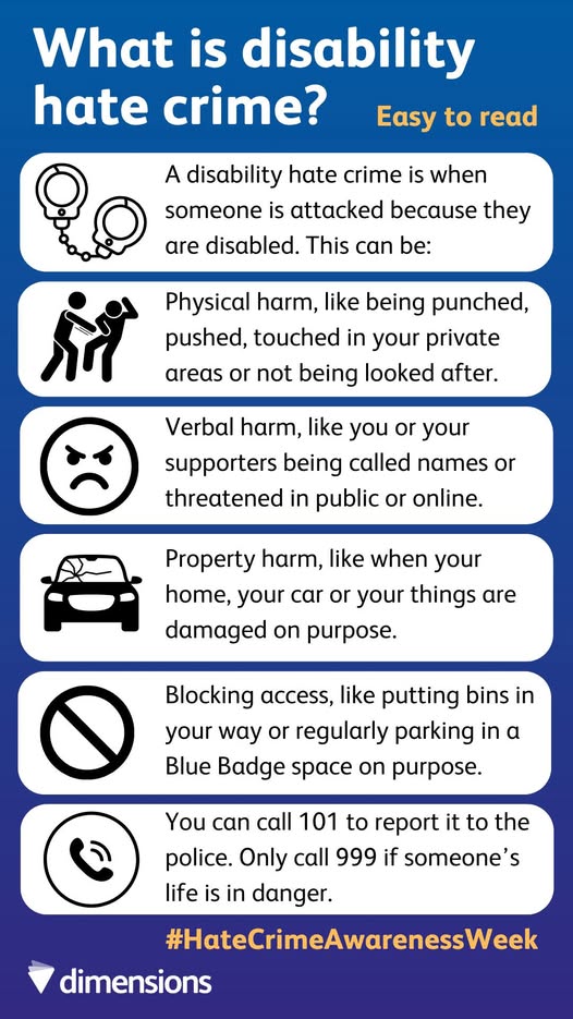 What is a disability hate crime? A disability hate crime is when someone is attacked because they are disabled. This can be: Physical harm, like being punched, pushed, touched in your private areas or not being looked after. Verbal harm, like you or your supporters being called names or threatened in public or online. Property harm, like when your home, your car or your things are damaged on purpose. Blocking access, like putting bins in your way or regularly parking in a Blue Badge space on purpose. You can call 101 to report it to the police. Only call 999 if someone’s life is in danger. #HateCrimeAwarenessWeek #HCAW Crown Prosecution Service (fb)