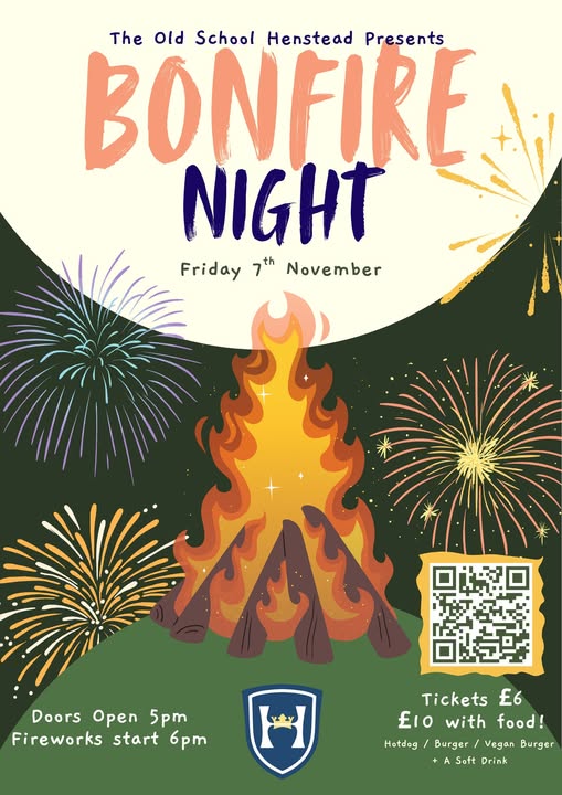 🔥✨ Bonfire Night at The Old School Henstead! ✨🔥 Just 2 weeks to go until our fabulous fireworks night! 🎆 Gates open at 5pm, fireworks at 6pm. 🎇 Enjoy sparklers, face painting and lots of goodies on sale, including glow-in-the-dark accessories to light up the night! 🌟 🍷 Plus, there’ll be mulled wine and beer for the grown-ups to enjoy. 🎟️ Tickets £6 or £10 with food (hotdog, burger or vegan burger + a soft drink). Everyone is welcome - this event isn’t just for our school community, so feel free to spread the word and bring family and friends along for a sparkling night to remember! 💥 Follow this link for tickets: https://ticketlab.app/series/2307#/ #BonfireNight #Fireworks #FamilyFun #HensteadEvents (fb)