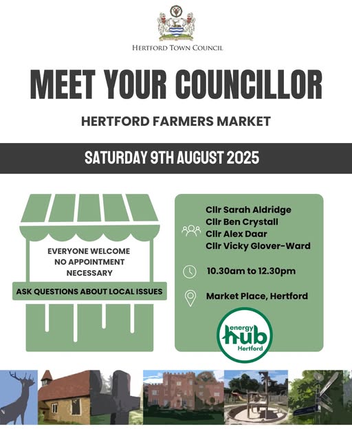 TODAY! 'Meet Your Councillor' at the Hertford Farmers Market - come and discuss the local issues that matter to you. PLUS: Come and see our Energy Hub too, to find out how to save energy and money, in your home. #meetyourcouncillor #hertfordfarmersmarket #localissues #energyhub #yourcouncil (fb)
