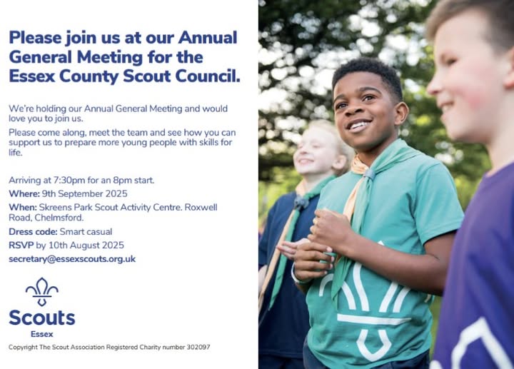 Our County AGM is coming up on 9th September at Skreens Park Activity Centre. We are looking for nominations for trustees with a variety of skills and talents including Risk Management, PR/ Networking, Legal and Media - if you are interested contact secretary@essexscouts.org.uk for more information (fb)