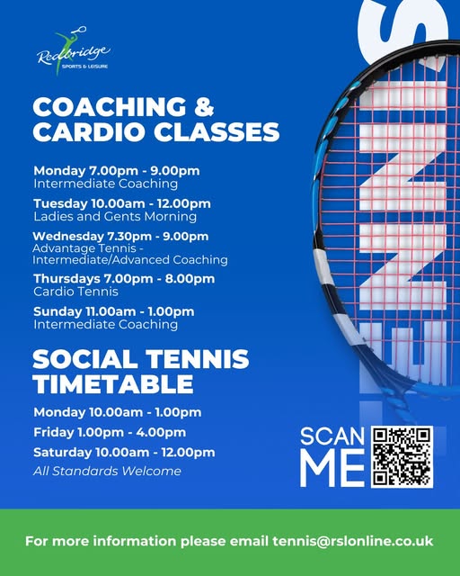 🎾 Ready to serve up some fun and fitness? Whether you're brushing up your technique, boosting your fitness, or just fancy a friendly hit, we've got something for every level! 🔥 Weekly Coaching & Cardio Classes 📆 Social Tennis Sessions – all standards welcome! 📩 Email tennis@rslonline.co.uk for more info or scan the QR code to get started. Which session will we see you at? 👇 #RedbridgeTennis #CardioTennis #SocialTennis #EastLondonFitness #TennisLife #RSLonline (fb)