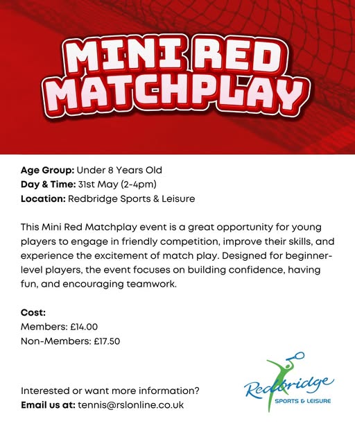 🎾 Mini Red Matchplay is back! A fun and friendly competition just for our under 8s! Perfect for beginners, this event is all about boosting confidence, building skills, and having a blast on court! 📅 31st May | ⏰ 2–4pm 📍 Redbridge Sports & Leisure 🎟️ £14 Members | £17.50 Non-Members 📩 Book your space: tennis@rslonline.co.uk #MiniRedTennis #RSLTennis #RedbridgeSports #TennisForKids #MatchplayFun #EastLondonTennis (fb)