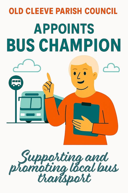 Old Cleeve Parish Council Appoints New Bus Champion! 🚍 We’re pleased to announce that Philip Bramall has been appointed as the new Bus Champion for Old Cleeve Parish Council. Philip will be working closely with the Somerset Bus Partnership to support and promote bus travel within the parish. His role includes representing local views on bus issues, gathering feedback, and sharing updates about services and campaigns. 📬 If you have any thoughts, questions, or ideas about bus services in the parish, you can contact Philip at: philipbramall68@gmail.com Let’s work together to keep our community connected! #OldCleeve #BusChampion #PublicTransport #SomersetBusPartnership #CommunityNews (fb)