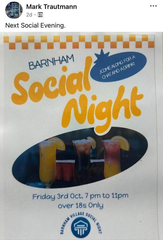 October’s Social Evening is on Friday the 3rd at the Village Hall from 7pm - come along for a friendly chat,and drink 🙂 (fb)