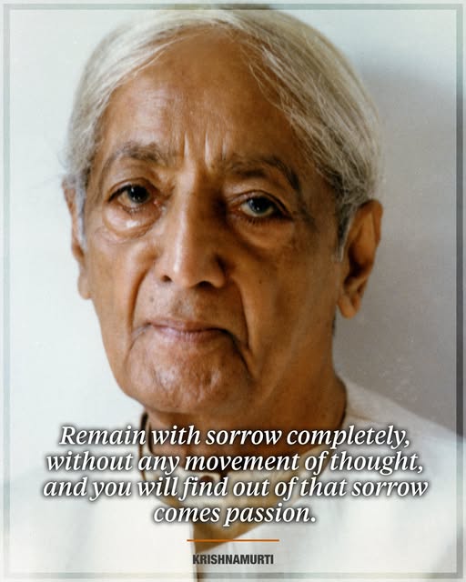 Remain with sorrow completely, without any movement of thought, and you will find out of that sorrow comes passion. Krishnamurti, The Awakening of Intelligence Context: The root meaning of the word ‘passion’ is sorrow. We have all had sorrow of some kind or another, losing somebody, the sorrow of self-pity, the sorrow of the human race, both collective and personal. We know what sorrow is. When we remain with that sorrow totally, without trying to rationalise it, without trying to escape from it in any form through words or through action, when you remain with it completely, without any movement of thought, then you will find out of that sorrow comes passion. That passion has the quality of love, and love has no sorrow. (fb)