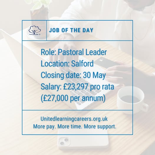 📣 Job of the day 📣 Role: Pastoral Leader Location: #Salford Closing date: 30 May Salary: £23,297 pro rata At United Learning, we aim to bring out the best in everyone daily. We are looking to appoint a Pastoral Leader. This is a wonderful opportunity for a committed, inspiring and nurturing Pastoral Leader to assist with the work of the behaviour and Pastoral team. The successful candidate will focus on behaviour management, wellbeing and communication with parents to support pupils with social and emotional well-being. If this could be you, find out more and apply now: https://ow.ly/1lsr50VRyzQ #JobOfTheDay #NowHiring #JobSearch #Hiring #Vacancy #ApplyNow #Education #OpenToWork #Jobs2Apply4 #JOTD (fb)