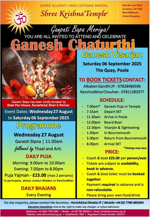 Ram, Ram & Jai Shree Krishna to all 🙏 Dear Devotees and Friends of Shree Krishna Temple, Coventry, 🕉️ Please find attached our kind invitation for you and your family to join us for this auspicious annual event Ganesh Chaturthi 2025, starting on Wednesday 27 August 2025. We invite you to take part in daily Ganesh puja and rituals, both in the morning and evening, please contact us to book your puja slot. Also please book your coach and boat tickets at the earliest for the Ganesh Visarjan, which will take place on Saturday 06 September 2025, this year we are travelling to The Quay, Poole. We hope to see all in good time and look forward your participation on all aspects of this event. Please see the attached poster for further information, kindly share with members of your community, family and friends. Jai Shree Krishna! 💐 Kind regards, Harish Dhokia JP, FRSA, MII, BEd, PgDIP, DipRIPHH, DipRSA, CertTESOL Secretary Temple Contact: Mobile: 07780 885004 Email: secretary@sktcoventry.org.uk (fb)