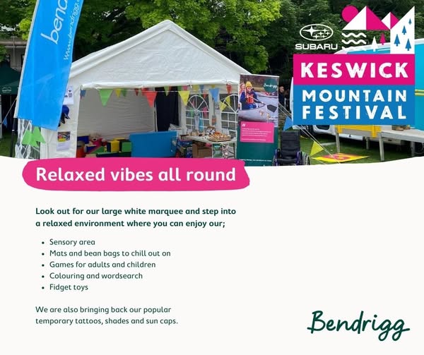 After a weekend of exciting challenge events across Cumbria, our team are already busy getting ready for the next set of events! Coming up this weekend, is Keswick Mountain Festival sponsored by Subaru UK where we will be set up from 16th-18th May. Look out for our large white marquee and step into a relaxed environment where you can enjoy our; Sensory area Mats and bean bags to chill out on Games for adults and children Colouring and wordsearch Fidget toys We are also bringing back our popular temporary tattoos, shades and sun caps. If you're at the festival over the weekend, please do stop by and say hello to our team! #KeswickMountainFestival #CumbriaEvents #BeMoreBendrigg #AccessibleAdventure (fb)