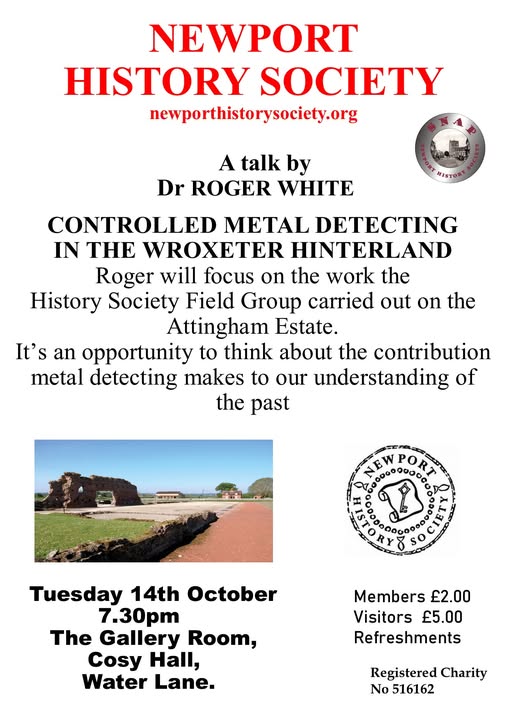 On Tuesday 14 October we have an exciting talk by Dr Roger White about metal detecting in the Wroxeter Hinterland. Where? Cosy Hall When? 730pm All welcome and refreshments will be served. (fb)