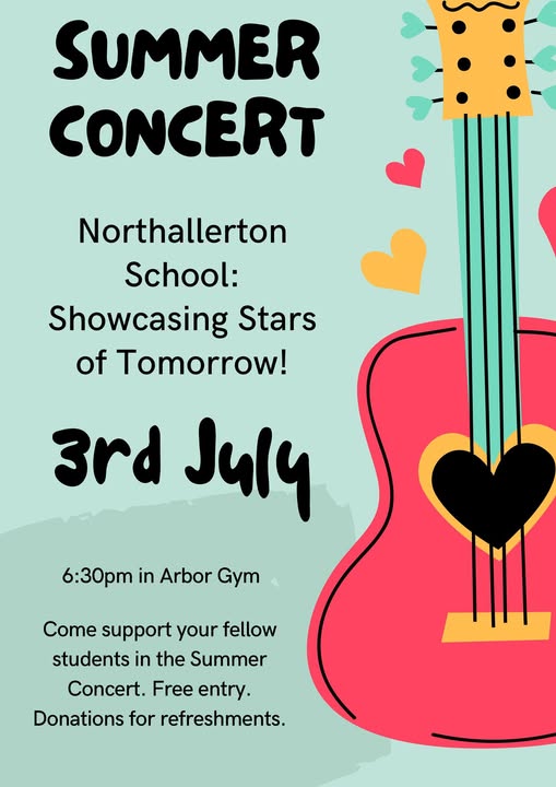 Northallerton School Summer Concert - SAVE THE DATE 📅 Thursday, 3rd July | 6.30pm in the Arbor Gym. |🎤 An Evening of Talent, Music & Community Our students are getting ready to light up the stage with their incredible talent. Let’s come together as a school community to celebrate creativity, confidence, and the joy of performance. (fb)