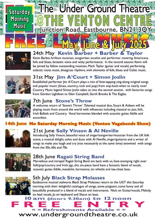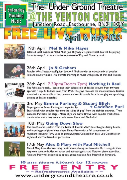 UNDER GROUND THEATRE: 17th May 2025 10.00am – 12.00noon (doors at 9.30am) THE VENTON CENTRE, JUNCTION ROAD, EASTBOURNE, BN21 3QY. This Saturday morning welcomes the return of popular and delightful vocal guitar/accordion duo, Alex & Mary from the Worthing music scene playing our favourite 60’s + songs in their very own style. Alex and Mary will be joined by special guest keyboard player Paul Mitchell. Entry is FREE: Teas and coffees will be on sale, with a free biscuit, still only £1.00. For other events and past performances visit https://www.undergroundtheatre.co.uk (fb)