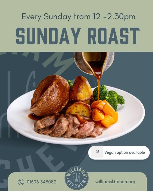 🍽️ Join us tomorrow for a delicious Sunday Roast at Williams' Kitchen! Looking for the perfect way to end the weekend? Come and enjoy a hearty, home-cooked Sunday roast at our cosy café with a cause. Great food, great atmosphere, and every bite supports the amazing work of YMCA Norfolk. 📍 Williams’ Kitchen – Aylsham Road Community Hub Come hungry, leave happy 💛 #SundayRoast #FeelGoodFood #WiliamsKitchen #CafeWithACause #YMCAFundraising (fb)