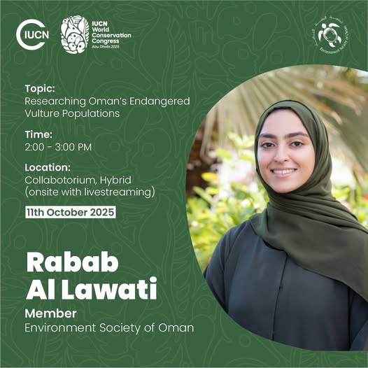 يسرنا الإعلان أن جمعية البيئة العُمانية ستشارك في المؤتمر العالمي للحفاظ على الطبيعة 2025، بتنظيم من هيئة البيئة في عُمان. كما ستقدّم الفاضلة رباب اللواتية ،عضو في جمعية البيئة العُمانية ، كلمة بعنوان : “أبحاث حول النسور المهددة بالانقراض في عُمان”. (fb)
