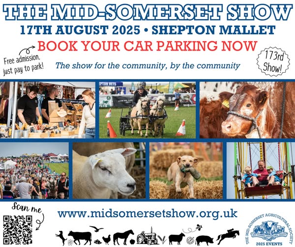🚗 Final Call for Reduced Car Parking! 🚗 Heading to the Mid-Somerset Show this Sunday 17th August? Don’t forget — you don’t need to pay admission, just book your parking in one of our official show car parks! £18 if you book now or £20 on the day. Take advantage of the final chance to grab reduced-rate parking and make your arrival hassle-free. 🎟️ Book now: 👉 https://midsomersetshow.ticketsrv.co.uk/tickets/ #MidSomersetShow2025 #FinalCall #CarParking #FreeEntry #SomersetEvents #BackBritishFarming #FamilyDayOut (fb)