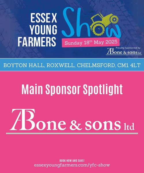 💫MAIN SPONSOR SPOTLIGHT💫 It is our greatest pleasure to welcome our Main Sponsor of the Essex Young Farmers Show 2025! “A T Bone & Sons Ltd is proud to be sponsoring the Essex Young Farmers Show this year. It is great to see such a well-organised event put together by the next generation of farmers, showcasing the dedication, passion, and hard work that keep the agricultural community thriving. Supporting young farmers is at the heart of what we do, and this sponsorship allows us to give back to the industry while also strengthening our presence within Essex’s rural community. We look forward to a brilliant day celebrating everything that makes British farming great!” We can’t thank the entire team at ATB enough – it’s been a real pleasure working with you. Your support has been invaluable. Don’t forget to visit their show-stopping stand and grab a refreshing drink from the Bone Bar! (fb)