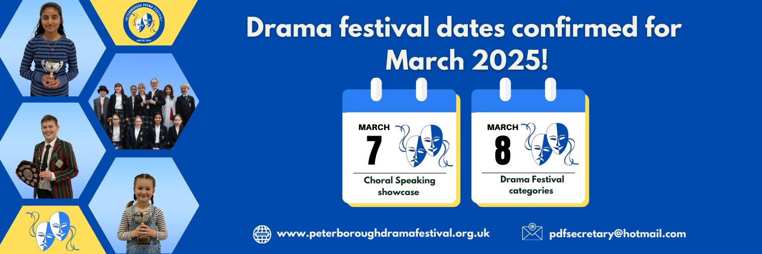 Peterborough Drama Festival Welcome to the Peterborough Drama Festival website. The 2025 festival begins in Days Hours Minutes Seconds The Peterborough Drama Festival 2025 Click on Gallery to see photographs of the 2025 Drama Festival. Peterborough Drama Festival showcased great local talent Published online by the Peterborough Telegraph in March 2025. Last weekend The Peterborough Drama Festival showcased an inspiring range of talent through choral speaking performances acting prose reading verse speaking duologues storytelling and prepared speech at the annual festival.