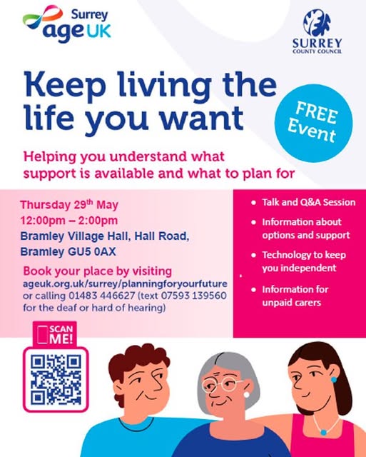 If you live near #Bramley this is your chance to book a free place for a presentation from Age UK Surrey and @surreycountycouncil that can help you make plans for the later life you want. Learn about care options, finances, staying independent and much more. Book at https://orlo.uk/YYiMl (fb)