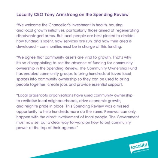 Locality CEO Tony Armstrong responds to the #SpendingReview: “We agree with the Chancellor that community assets are vital to growth. That’s why it’s so disappointing to see the absence of funding for community ownership in the Spending Review. Renewal can only happen with the direct involvement of local people. The Government now must set out a clear way forward on how to put community power at the top of their agenda.” (fb)
