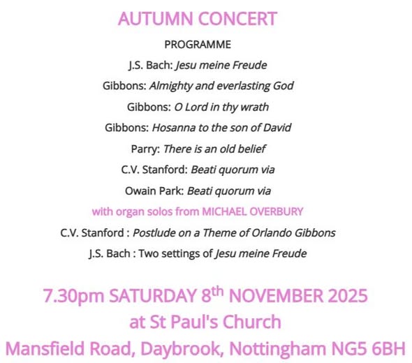Tickets are available on the door for our concert this afternoon at 3.30pm at West Bridgford Methodist Church. Tickets include a cream tea in the interval. (fb)