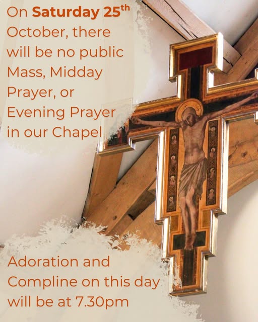 Please note that this coming Saturday, 25th October, there will be no public Mass, Midday Prayer, or Rosary & Evening Prayer in our Chapel. Adoration followed by Compline will be at the earlier time of 7.30pm. (fb)