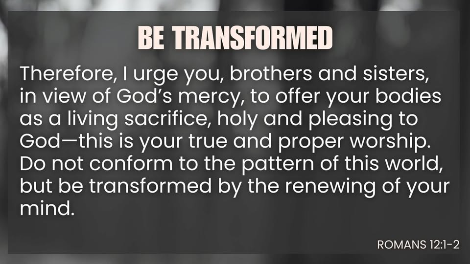 Therefore, I urge you, brothers and sisters, in view of God’s mercy, to offer your bodies as a living sacrifice, holy and pleasing to God—this is your true and proper worship. Do not conform to the pattern of this world, but be transformed by the renewing of your mind. (Romans 12:1-2) (fb)