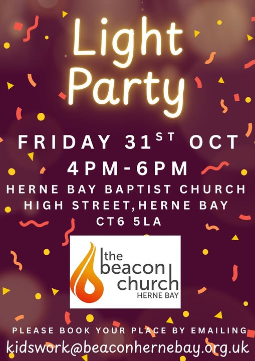 LIGHT PARTY!! Party games, crafts, music, food and drinks, a party to celebrate JESUS- The light of the world!! ANYONE WELCOME to join us! Just please book your place bia...... kidswork@beaconhernebay.org.uk!! (fb)