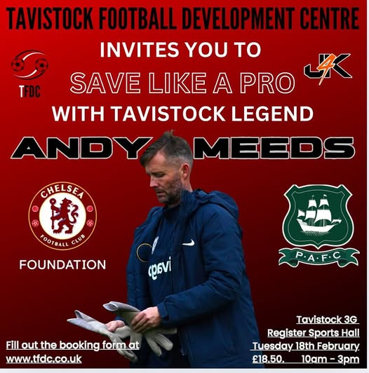 Spaces are filling fast for this ONE-OFF Half-Term Event with Tavistock Football Development Centre Elite GK training with Andy Meeds – coach at Chelsea FC & Plymouth Argyle! ⭐ Limited spots left! First come, first served. Train with one of the best: 🧤 J4Keepers Trainer ⚽ Chelsea FC Foundation Coach ⚽ Plymouth Argyle GK Coach (ADC/ETC & Women’s) ⚽ Mount Kelly Girls Scholarship Coach ⚽ Former semi-pro GK 🔝 Master pro-level techniques & sharpen your skills! 📅 Date: Tuesday, 18 February 📍 Venue: Tavistock College 3G 🕙 Time: 10am - 3pm 💷 Cost: Only £18.50! 📲 Book now: www.tfdc.co.uk Train with the best – become the best! #GoalkeeperTraining #EliteGK #TrainWithTheBest #AndyMeeds #ChelseaFC #PlymouthArgyle #FootballDevelopment #TavistockFootball #GKSkills #ProTraining #HalfTermFootball #FutureKeepers #tfdc (fb)